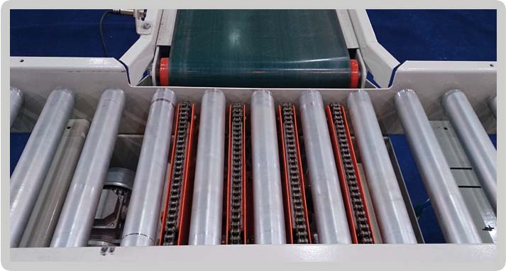 A chain transfer transports different products at 90° moving it away from the conveyor line. The chains are mounted between the rollers and are pneumatically raised for the diverting movement.